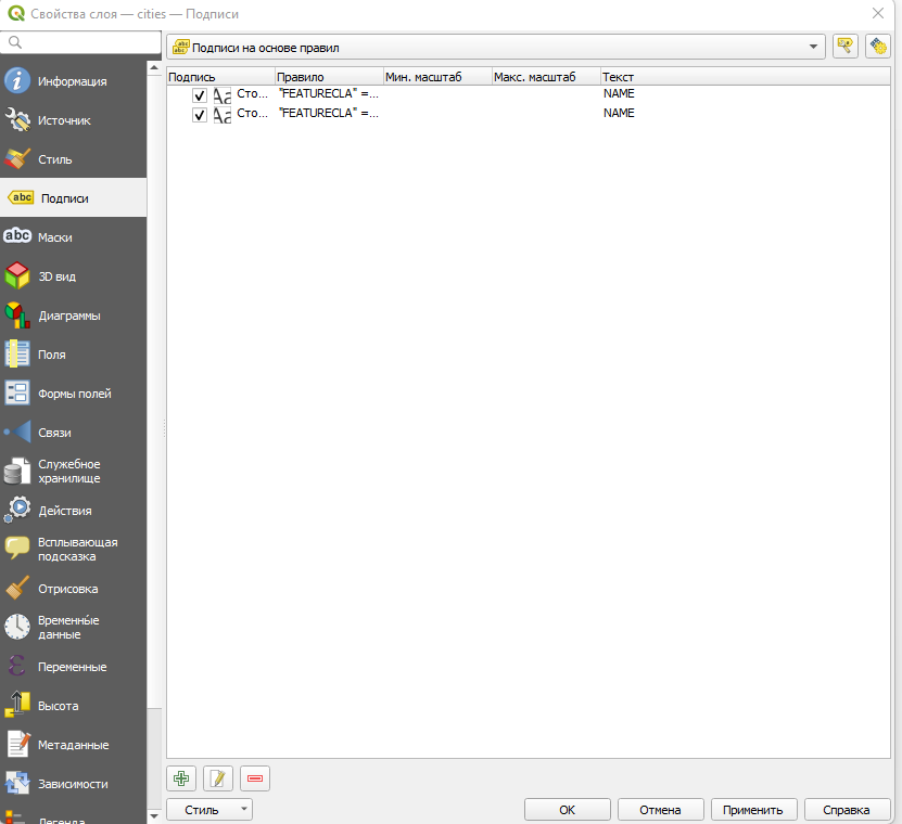 Чтобы установить подписи на основе правил, нужно зайти в свойства слоя (правой клавишей мыши кликнем на слой на панели слоев и в самом низу меню ищем Свойства), после чего во вкладке “Подписи” в верхнем всплывающем меню выбираем “Подписи на основе правил”.