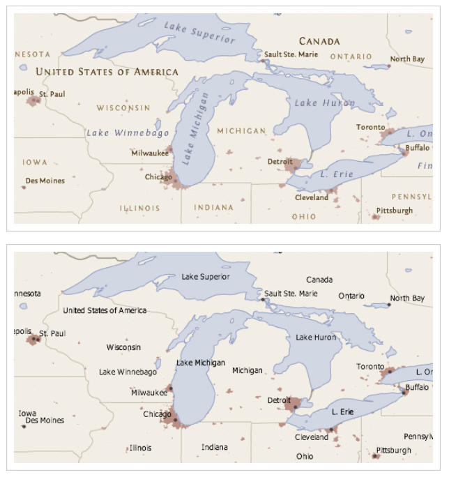Для большей убедительности посмотрите на пример ниже. Ради эксперимента попробуйте поочередно, используя карты, найти топонимы из списка: Iowa (штат), Sault Ste. Marie (город), Winnebago (озеро), North Bay (город). На какой карте получилось сделать это быстрее?