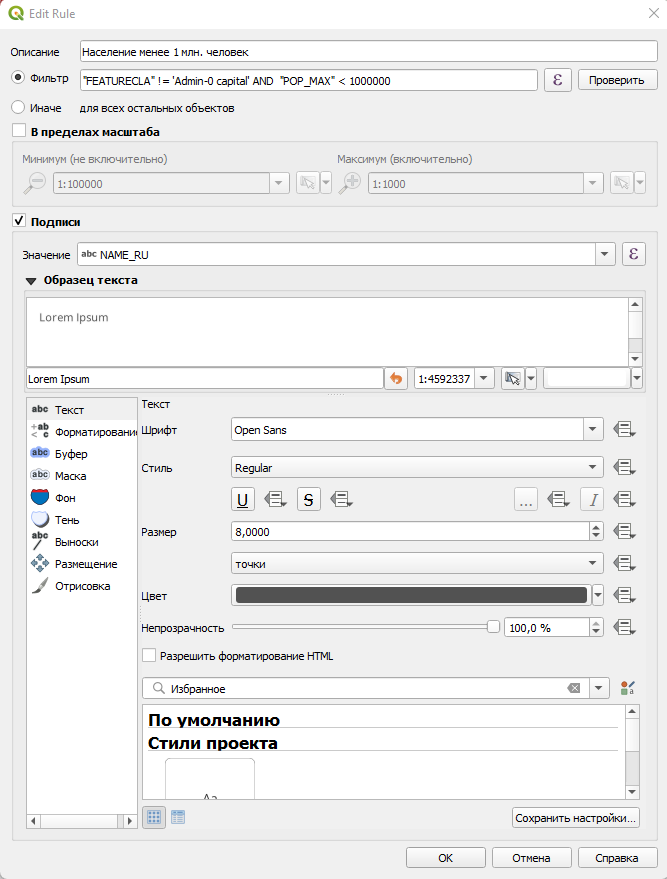 Теперь заполняем новое правило, меняем описание и настройки стиля слоя, а также пишем новый код. Обратите внимание, что для второй категории городов я уменьшил размер шрифта, чтобы показать иерархию. Но далее мы отойдем от административной иерархии в учебных целях и будем отталкиваться от численности населения.