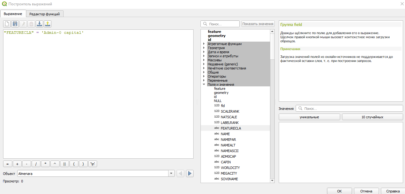 В открытом редакторе выражений довольно удобно писать формулы. Например, если открыть вкладку "Поля и значения" и кликнуть на нужное нам поле, то оно сразу печатается слева без ошибок.