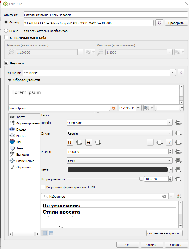 После того как код написан, нажимаем "ОК" и создаем еще два стиля: один для городов с населением больше 1 млн человек и один для тех, которые меньше.
