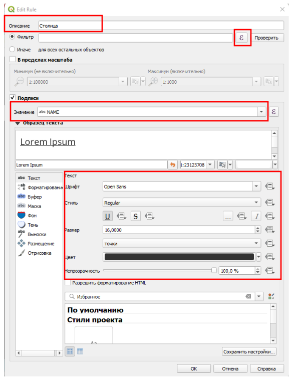 Для начала установим шрифт для столицы страны, но перед этим в строке “Описание” подпишем, для чего мы устанавливаем правило. Убедимся, что будем подписывать значением, взятым из колонки с именем города, и после этого настроим стили. Чтобы установить правило рядом со строкой “Фильтр”, вверху нажмем на кнопку с буквой ε. Можно вписывать правила сразу в строчку, но через дополнительное меню это сделать проще.