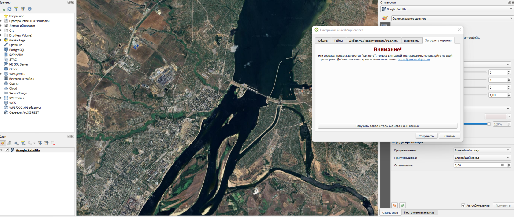 После установки модуля доступно всего несколько базовых карт, но их количество можно увеличить, используя этот же плагин. Просто заходите в настройки модуля (Интернет — QuickMapServices — Настройки — Загрузить сервисы) и нажимаете на большую кнопку “Получить дополнительные источники данных”.