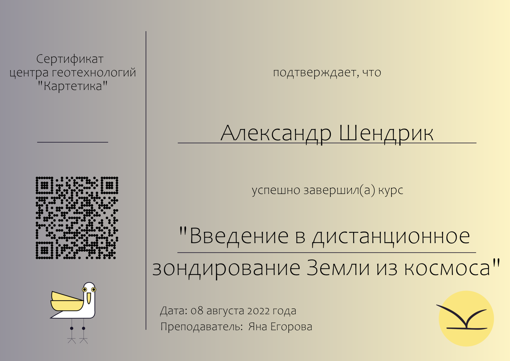 Страница подтверждает оригинальность сертификата, человек действительно прошёл данный курс в центре геотехнологий "Картетика"