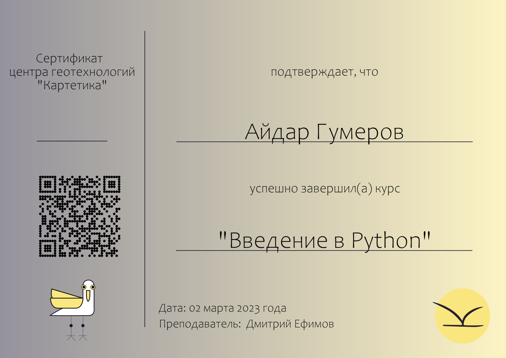 Страница подтверждает оригинальность сертификата, человек действительно прошёл данный курс в центре геотехнологий "Картетика"