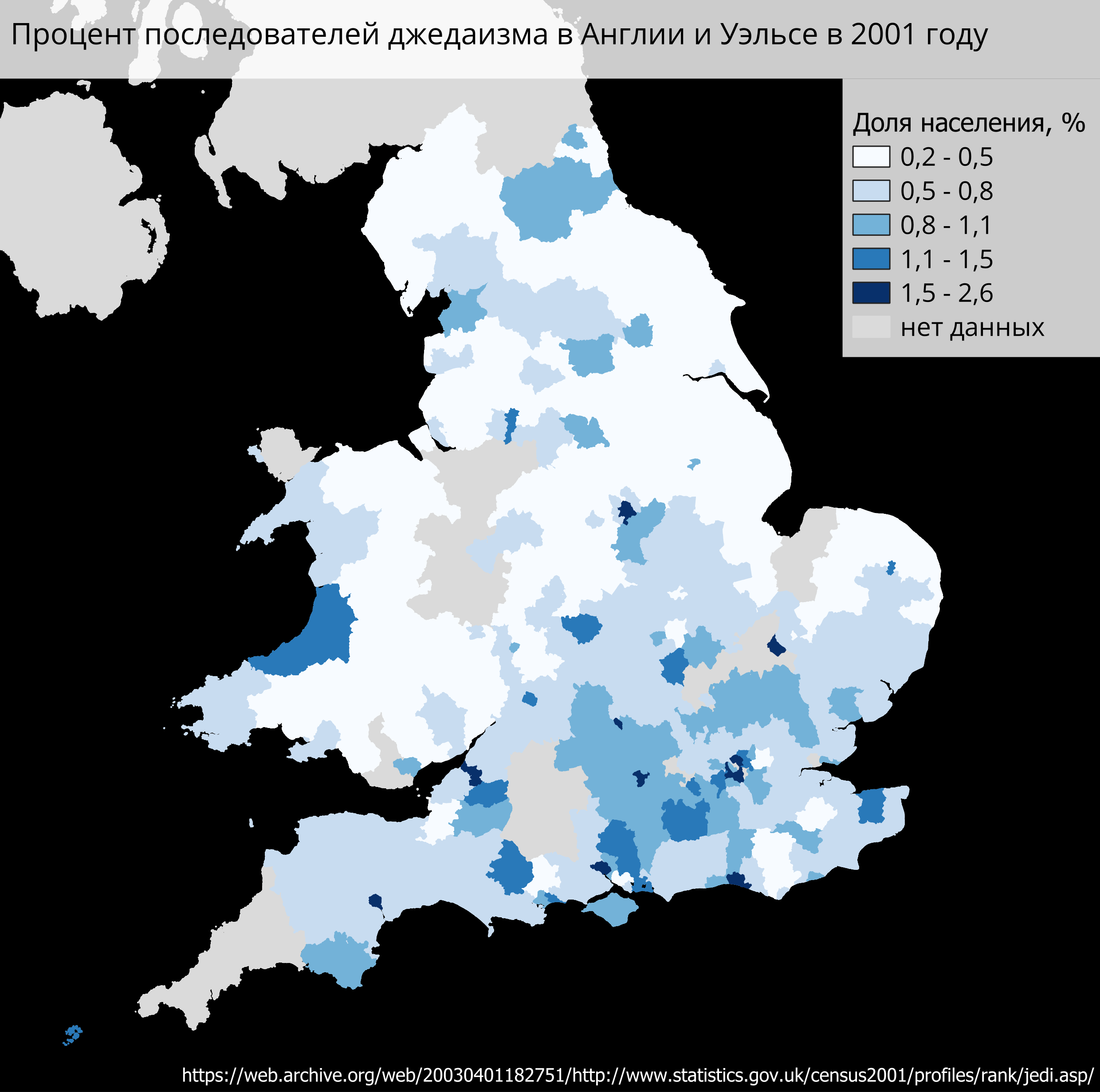 В нашем примере мы будем делать карту распространения Джедаизма (от слова “джедай”, это такие рыцари из вселенной Звездных Войн) в Англии и Уэльсе по результатам переписи населения 2001 года.